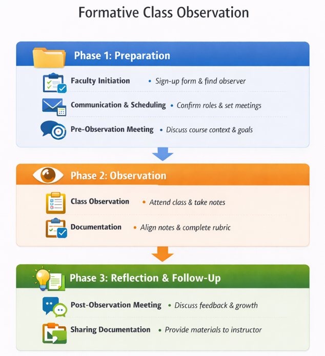 This formative process, which is highly recommended, allows faculty to select their own peer observers, utilizes the same observation rubric as the one for the mandatory process, and attend a post-observation meeting to receive constructive peer feedback and have an opportunity to brainstorm actionable strategies to address issues. Faculty are strongly encouraged to participate in the formative process early enough to help them prepare for the mandatory class observation. Faculty may also use the observation notes and rubrics generated from the formative process as supplementary evidence of teaching development to support their reviews.